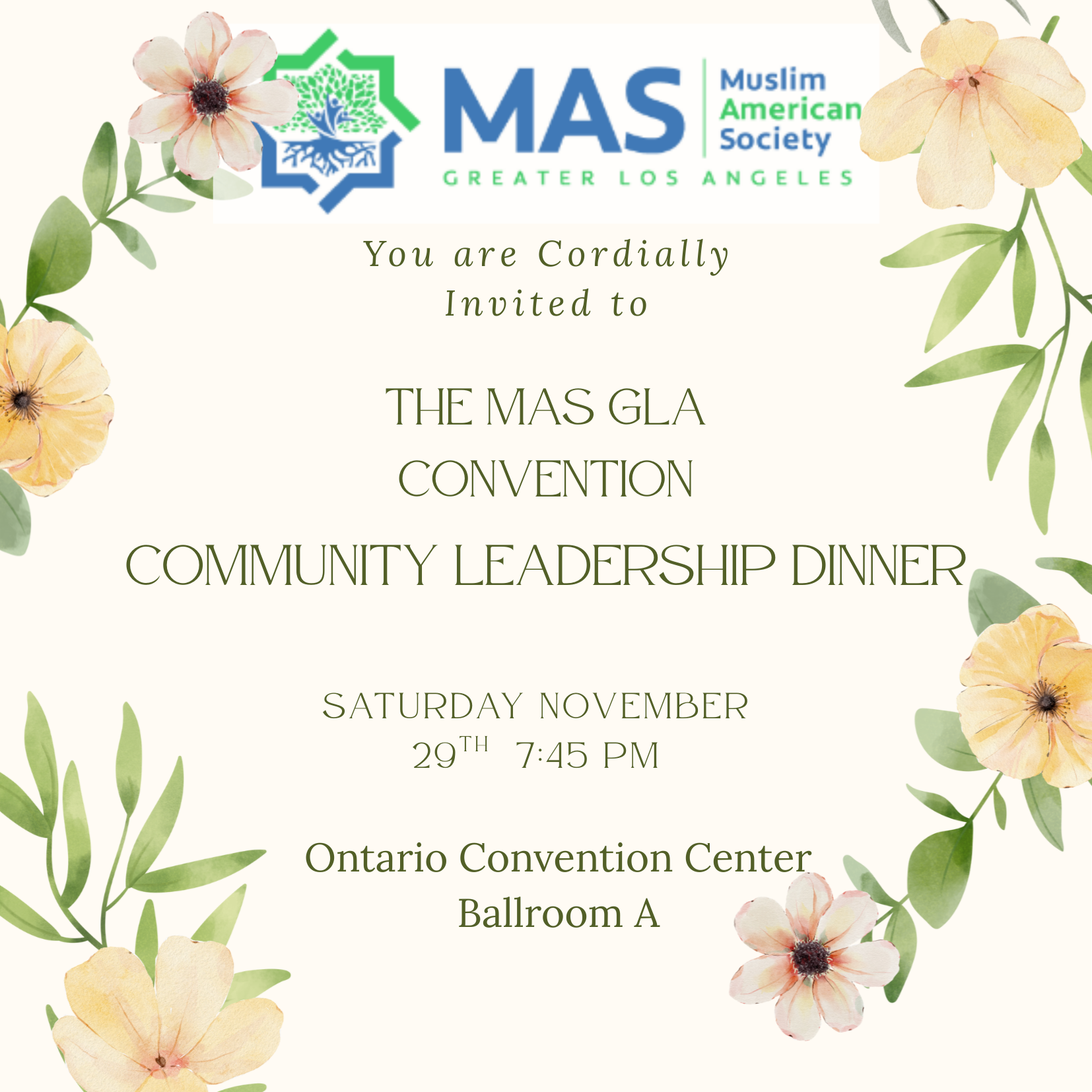 You are cordially invited to attend the MAS GLA Convention’s Annual Invite-Only Community Leaders Dinner, held in conjunction with the MAS Convention. Every year MAS provides a platform for leaders and activists like yourself to have dinner while sharing visions for our community. It will be an opportunity to bring together renowned community leaders to connect, evaluate, and learn from each other. We graciously request your presence at this event, as it will not be complete without you. Please arrive punctually, as food will be served promptly upon commencement.