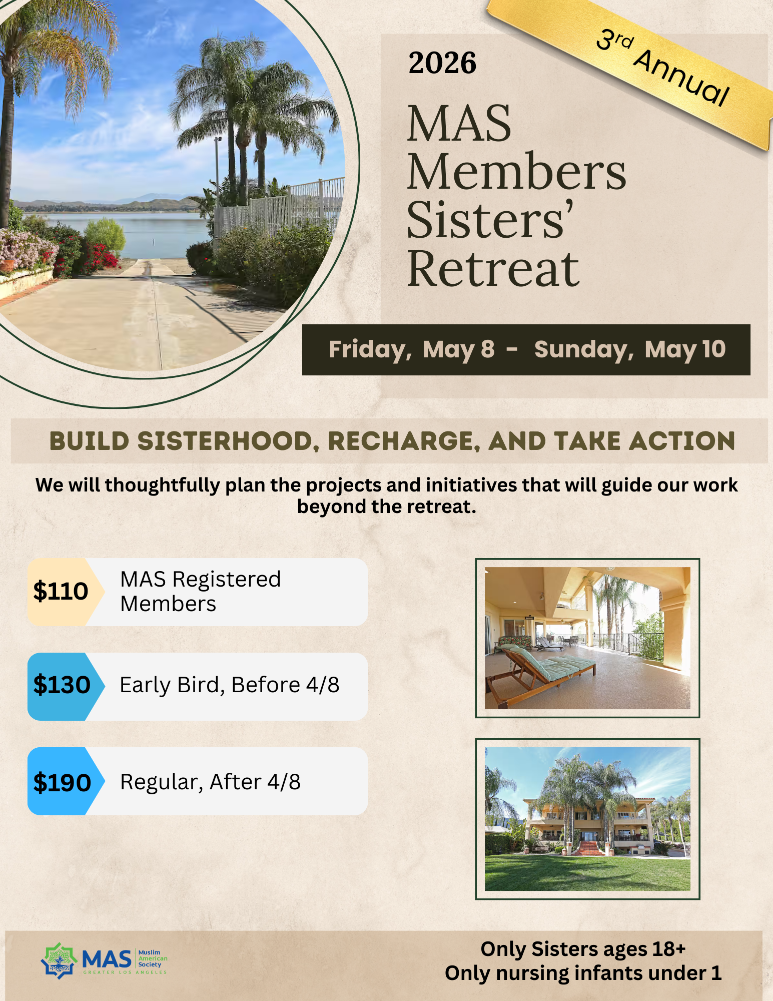MAS GLA Members Sisters' Retreat 2026This retreat is for registered MAS members and active Usrah members.Please enable JavaScript in your browser to complete this form.Please enable JavaScript in your browser to complete this form.Name *FirstLastEmail *PhonePlease list any known allergies *If you have no known allergies, type "N/A"Medical Conditions Organizers should be aware of *Current Medications (Optional) *Specific Room accomodation Needed (Due to Health concerns)We will make every reasonable effort to accommodate health-related room needs; however, specific room arrangements cannot be guaranteed.Usra leader nameRegionIEOCLAValleyOtherEmergency contact informationPlease enter the name of the parent or guardian who should be contacted in the case of an emergency.Relationship *SpouseSiblingRelativeFriendEmergency Contact Name *FirstLastEmergency Contacy PhoneAddressAddress Line 1Address Line 2CityState / Province / RegionPostal Code--- Select country ---AfghanistanAlbaniaAlgeriaAmerican SamoaAndorraAngolaAnguillaAntarcticaAntigua and BarbudaArgentinaArmeniaArubaAustraliaAustriaAzerbaijanBahamasBahrainBangladeshBarbadosBelarusBelgiumBelizeBeninBermudaBhutanBolivia (Plurinational State of)Bonaire, Saint Eustatius and SabaBosnia and HerzegovinaBotswanaBouvet IslandBrazilBritish Indian Ocean TerritoryBrunei DarussalamBulgariaBurkina FasoBurundiCabo VerdeCambodiaCameroonCanadaCayman IslandsCentral African RepublicChadChileChinaChristmas IslandCocos (Keeling) IslandsColombiaComorosCongoCongo (Democratic Republic of the)Cook IslandsCosta RicaCroatiaCubaCuraçaoCyprusCzech RepublicCôte d'IvoireDenmarkDjiboutiDominicaDominican RepublicEcuadorEgyptEl SalvadorEquatorial GuineaEritreaEstoniaEswatini (Kingdom of)EthiopiaFalkland Islands (Malvinas)Faroe IslandsFijiFinlandFranceFrench GuianaFrench PolynesiaFrench Southern TerritoriesGabonGambiaGeorgiaGermanyGhanaGibraltarGreeceGreenlandGrenadaGuadeloupeGuamGuatemalaGuernseyGuineaGuinea-BissauGuyanaHaitiHeard Island and McDonald IslandsHondurasHong KongHungaryIcelandIndiaIndonesiaIran (Islamic Republic of)IraqIreland (Republic of)Isle of ManIsraelItalyJamaicaJapanJerseyJordanKazakhstanKenyaKiribatiKorea (Democratic People's Republic of)Korea (Republic of)KosovoKuwaitKyrgyzstanLao People's Democratic RepublicLatviaLebanonLesothoLiberiaLibyaLiechtensteinLithuaniaLuxembourgMacaoMadagascarMalawiMalaysiaMaldivesMaliMaltaMarshall IslandsMartiniqueMauritaniaMauritiusMayotteMexicoMicronesia (Federated States of)Moldova (Republic of)MonacoMongoliaMontenegroMontserratMoroccoMozambiqueMyanmarNamibiaNauruNepalNetherlandsNew CaledoniaNew ZealandNicaraguaNigerNigeriaNiueNorfolk IslandNorth Macedonia (Republic of)Northern Mariana IslandsNorwayOmanPakistanPalauPalestine (State of)PanamaPapua New GuineaParaguayPeruPhilippinesPitcairnPolandPortugalPuerto RicoQatarRomaniaRussian FederationRwandaRéunionSaint BarthélemySaint Helena, Ascension and Tristan da CunhaSaint Kitts and NevisSaint LuciaSaint Martin (French part)Saint Pierre and MiquelonSaint Vincent and the GrenadinesSamoaSan MarinoSao Tome and PrincipeSaudi ArabiaSenegalSerbiaSeychellesSierra LeoneSingaporeSint Maarten (Dutch part)SlovakiaSloveniaSolomon IslandsSomaliaSouth AfricaSouth Georgia and the South Sandwich IslandsSouth SudanSpainSri LankaSudanSurinameSvalbard and Jan MayenSwedenSwitzerlandSyrian Arab RepublicTaiwan, Republic of ChinaTajikistanTanzania (United Republic of)ThailandTimor-LesteTogoTokelauTongaTrinidad and TobagoTunisiaTurkmenistanTurks and Caicos IslandsTuvaluTürkiyeUgandaUkraineUnited Arab EmiratesUnited Kingdom of Great Britain and Northern IrelandUnited States Minor Outlying IslandsUnited States of AmericaUruguayUzbekistanVanuatuVatican City StateVenezuela (Bolivarian Republic of)VietnamVirgin Islands (British)Virgin Islands (U.S.)Wallis and FutunaWestern SaharaYemenZambiaZimbabweÅland IslandsCountryQuestions or commentsCoupon Apply Cancelation and Refund Policy *I have read and agree to the cancellation and refund policy.Cancellations made on or before April 7 will receive a full refund. Cancellations after this date are non-refundable due to advance commitments for lodging, meals, and materials. Registration may be transferable to another MAS GLA member with prior approval from the organizers. Participation Oath *I commit to attend the full retreat program from Friday to Sunday known Needed or Registration *Price: $130.00Total$0.00Debit or credit card information *CardName on CardSubmit